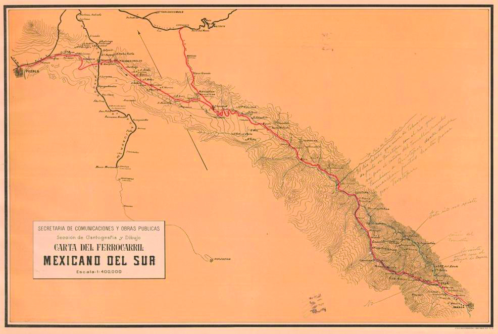 La construcción de la vía férrea hacia el estado de Oaxaca se enfrentó con enormes retos topográficos, pues la accidentada geografía hacía inviable un trazado directo.