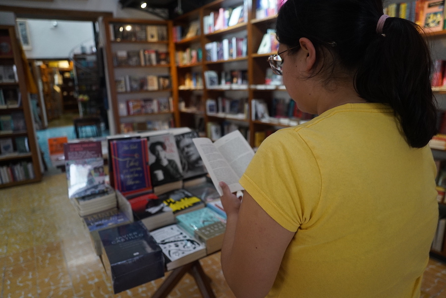 Los toman con cuidado de los estantes. Los leen con atención. Hojean una página, dos. Una vez que les he dado los buenos días no tengo nada más que decir, solo me queda esperar a que alguno de ellos requiera un título, un precio o la dirección del sanitario. Le doy una hojeada al libro que tomé hace un momento de la sección de editoriales oaxaqueñas. Ella está casi frente a mí, se acerca a preguntarme por un libro. No recuerda ni el título ni el autor, solo una parte de la historia, y vagamente el nombre del protagonista. Sonrío y respondo: “Aura, de Carlos Fuentes”. Le indico dónde está y ella va hacia allá. Él se ha sentado en la ventana con un libro en las manos, pero luego voltea hacia la calle y se pierde, no vuelve a abrir el ejemplar. Se pasa los dedos de la mano que tiene libre por la zona debajo de la nariz, como si tuviera un bigote tupido, pero no hay nada ahí, solo alguna sensación de seguridad, o de duda, o de nostalgia. Ella ha encontrado a Aura, pero también a los buenos vecinos de los que habla Walter Benjamin: Cristina Rivera Garza, por un lado, Elena Garro, por el otro, una novedad de un querido conocido, Daniel Saldaña París.