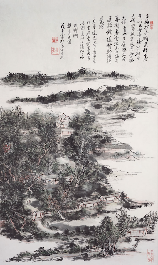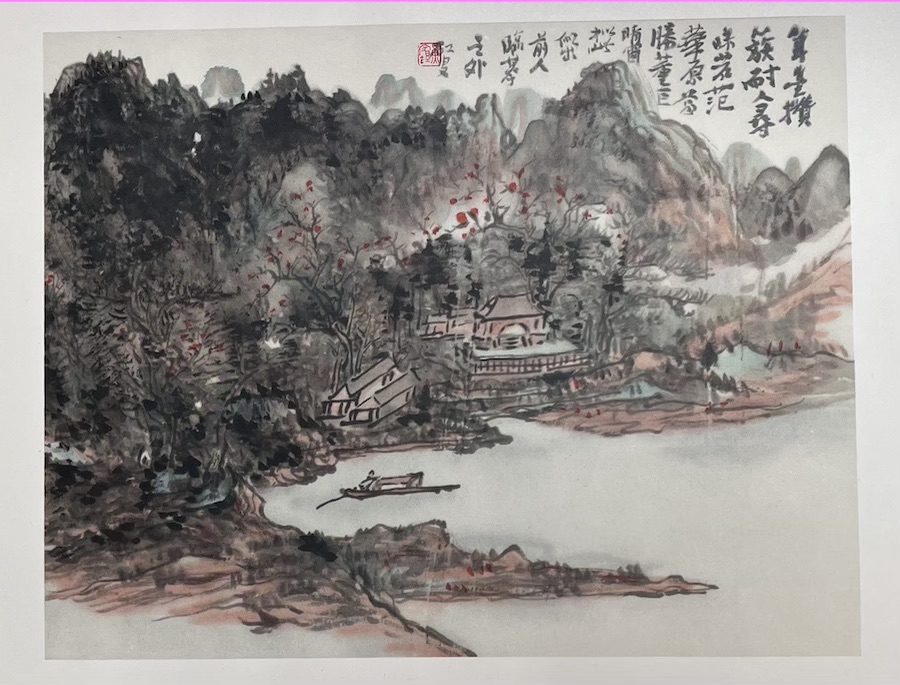 Voy del libro al buscador de Google para poder investigar un poco más sobre la vida y obra de este artista, y descubro, gracias a esa pequeña investigación y a lo que el prologuista señala en el mismo álbum, que Hwang Ping-Hoong fue un viajero entusiasta, quien dedicó gran parte de su vida a recorrer China. Anduvo de norte a sur, visitando y retratando cuerpos de agua, como el Río Yangste y el Río Hoang Ho; no lo detuvo el reto de escalar las peligrosas montañas de Szechuen, o las formaciones montañosas kársticas de Kweling, y se dejó maravillar por las hermosas colinas de HwaSan y Hwang Shan. Gracias a esos viajes por su país logró condensar una penetrante visión que le permitió atesorar y reflejar en su obra las sensaciones que le producían, por ejemplo, el césped o la hoja de un árbol, para él la esencia misma de su patria. Cada uno de esos paisajes provenientes de sus pinceladas —en las que parecen sobresalir los colores oscuros (con algunos reflejos de rojo intenso para delinear ramas de árboles o pilares de casas)— están acompañados de poemas y dedicatorias, como la que a continuación les comparto (claramente traducida, pero que podrán apreciar en la imagen en su lengua original):