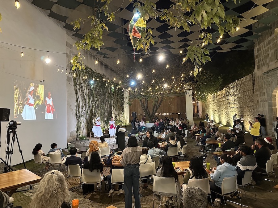 Por primera vez presenciamos un evento inaugural titulado “El ritual del vestir mesoamericano” en el que colaboramos las comunidades de Santo Tomás Jalieza, El Tapanco–Santa María Zacatepec, Santa María Tlahuitoltepec y San Pedro Cajonos. Cada uno de los representantes compartió parte de la indumentaria de su comunidad: el significado de la iconografía, las técnicas empleadas, los cambios que ha tenido y la manera en que se porta. En mi caso, viví un momento único y valioso al lado de mi mamá al compartir la indumentaria antigua y actual de la mujer de San Pedro Cajonos. En ese acto expresamos el ritual que llevamos a cabo al momento de vestirnos —desde colocarnos el refajo hasta la manera de ceñirnos—, el vínculo que se genera con la memoria colectiva, el significado de cada uno de los elementos iconográficos, así como los momentos que han marcado nuestra historia.