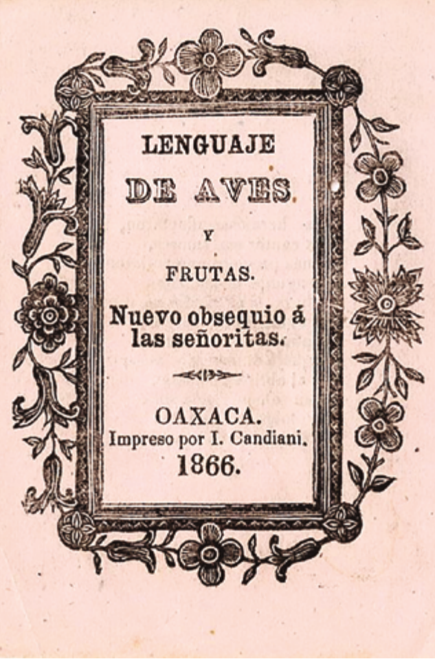 Su nombre es Lenguaje de aves y frutas. Nuevo obsequio á las señoritas, impreso en Oaxaca por I. Candiani en 1866. Es un texto anónimo, y del impresor apenas se saben algunos datos (tarea pendiente). Su nombre: José Ignacio Candiani, oaxaqueño “quien aprendió el oficio de un tipógrafo de origen inglés llamado Guillermo Haaf, quien trajo de Norteamérica a Oaxaca una imprenta”.2 Comenzó su trabajo de impresor en los años cuarenta (1844 aprox.), en la calle de Larrazábal, y en 1877 fue nombrado director de la imprenta del estado, cargo que mantuvo cerca de diez años ininterrumpidos; asimismo, estuvo varios años al frente de la cátedra de tipografía y litografía en el Instituto de Ciencias y Artes del Estado.3 Sobre este último escribió e imprimió, en 1882, el Manual de tipografía, para que sirva de obra de texto a los alumnos de la cátedra que está bajo su dirección. En 1888 abre por última vez, para cerrar definitivamente4 su imprenta.