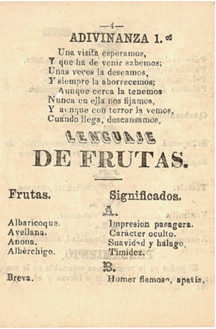 Es una publicación “dedicada a las mujeres” en donde se asocian nombres de aves y frutas con supuestos significados (¿de dónde salió esa relación?), lo cual pude entender mejor al leer el poema introductorio en donde menciona que las mujeres utilizan las flores para expresar sentimientos y sugiere que el hombre debe responder con el simbolismo de frutas y aves. El lenguaje de las flores al que hace referencia se conoce también como “floriografía” y es un tipo de lenguaje criptológico creado durante el siglo XIX, que se utilizó para expresar sentimientos de amor o pasión de manera “secreta”: así, cada flor tenía su propio significado y simbolismo.5 El lenguaje de las aves y frutas contenido en este folleto es también un tipo de lenguaje criptológico, y no voy a dejar pasar la oportunidad de compartir un par de ejemplos: Langosta refiere a “Eres la sombra de la destrucción;” Tuna colorada, por otra parte, significa “coquetería”.