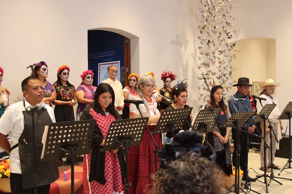 Fueron 24 personas quienes integraron el elenco: niños y lectores voluntarios dieron vida a leyendas, relatos y canciones que evocaron la presencia de quienes siguen habitando nuestra memoria. Los asistentes disfrutaron de la leyenda La flor de cempasúchil; la lectura musicalizada Las chinguiñas del perro, una adaptación del maestro Emilio Lome; y las canciones dedicadas a la calaverita de azúcar y a la Catrina, interpretadas por el coro Calacantos y músicos invitados (guitarrista, clarinetista y cantante).
