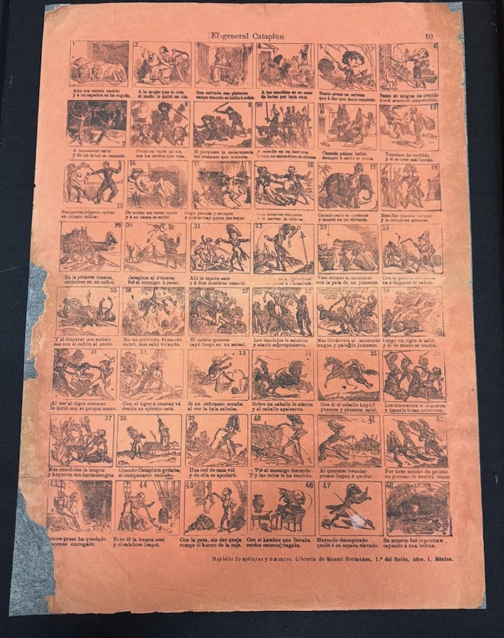 En el caso de la Biblioteca Henestrosa se trabajó con un conjunto de 34 aucas o aleluyas, piezas gráficas populares de origen europeo, especialmente difundidas entre los siglos XVIII y XIX. Estas impresiones, organizadas en viñetas numeradas, tenían fines educativos, recreativos y morales. Impresas en papel económico, su fragilidad contrasta con la riqueza narrativa y visual que contienen.
